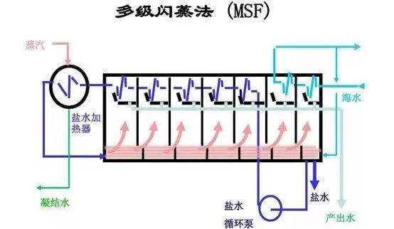 多級(jí)閃蒸(MSF)是將熱鹽水引入閃蒸室后過(guò)熱而急速的部分氣化,從而使熱鹽水自身的溫度降低,所產(chǎn)生的蒸汽冷凝后即為所需的除鹽水。多級(jí)閃蒸法不僅用于海水淡化,而且已廣泛用于火力發(fā)電廠、石油化工廠的鍋爐供水、工業(yè)廢水和礦井苦咸水的處理與回收,以及印染工業(yè)、造紙工業(yè)廢堿液的回收。